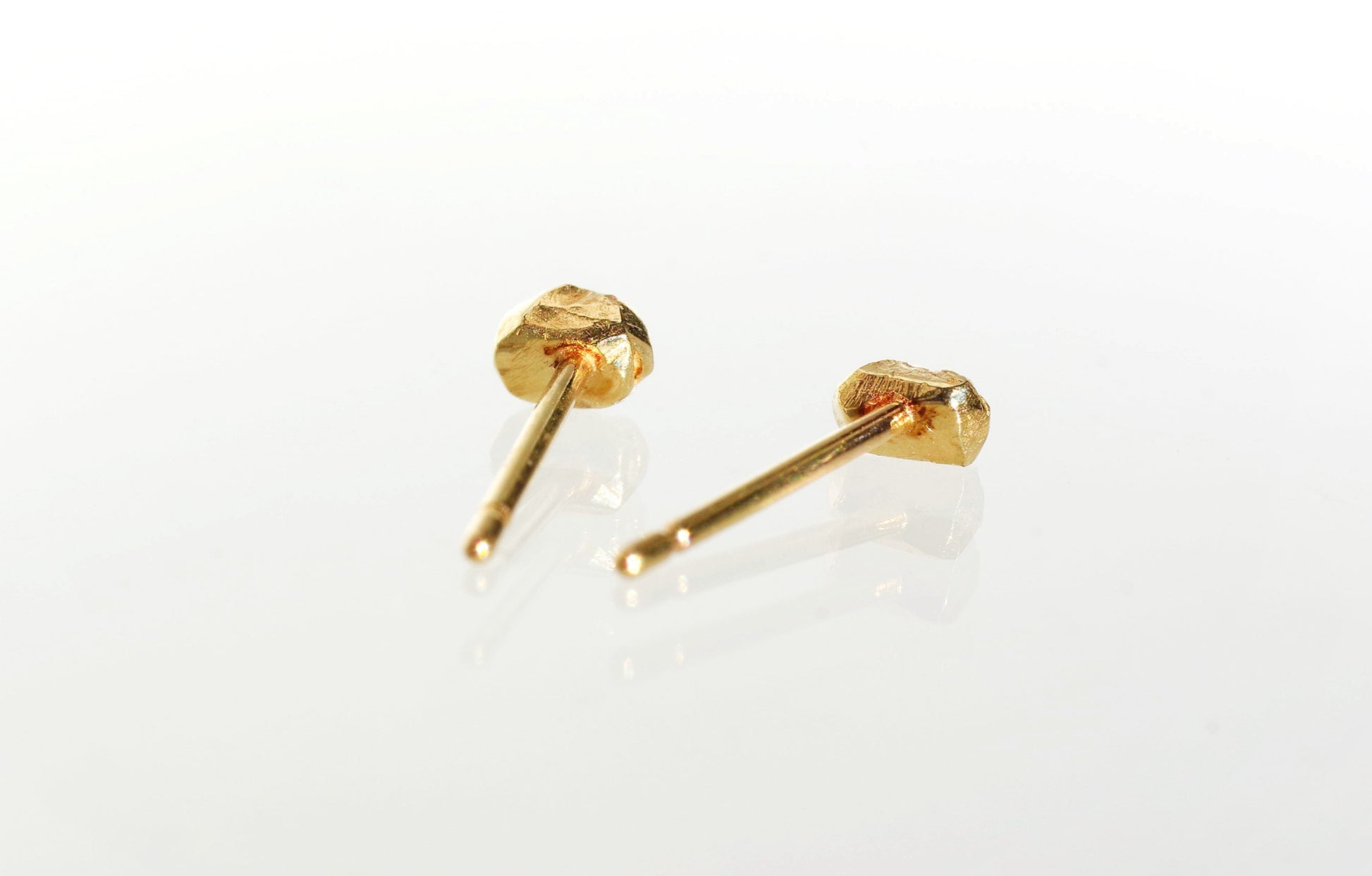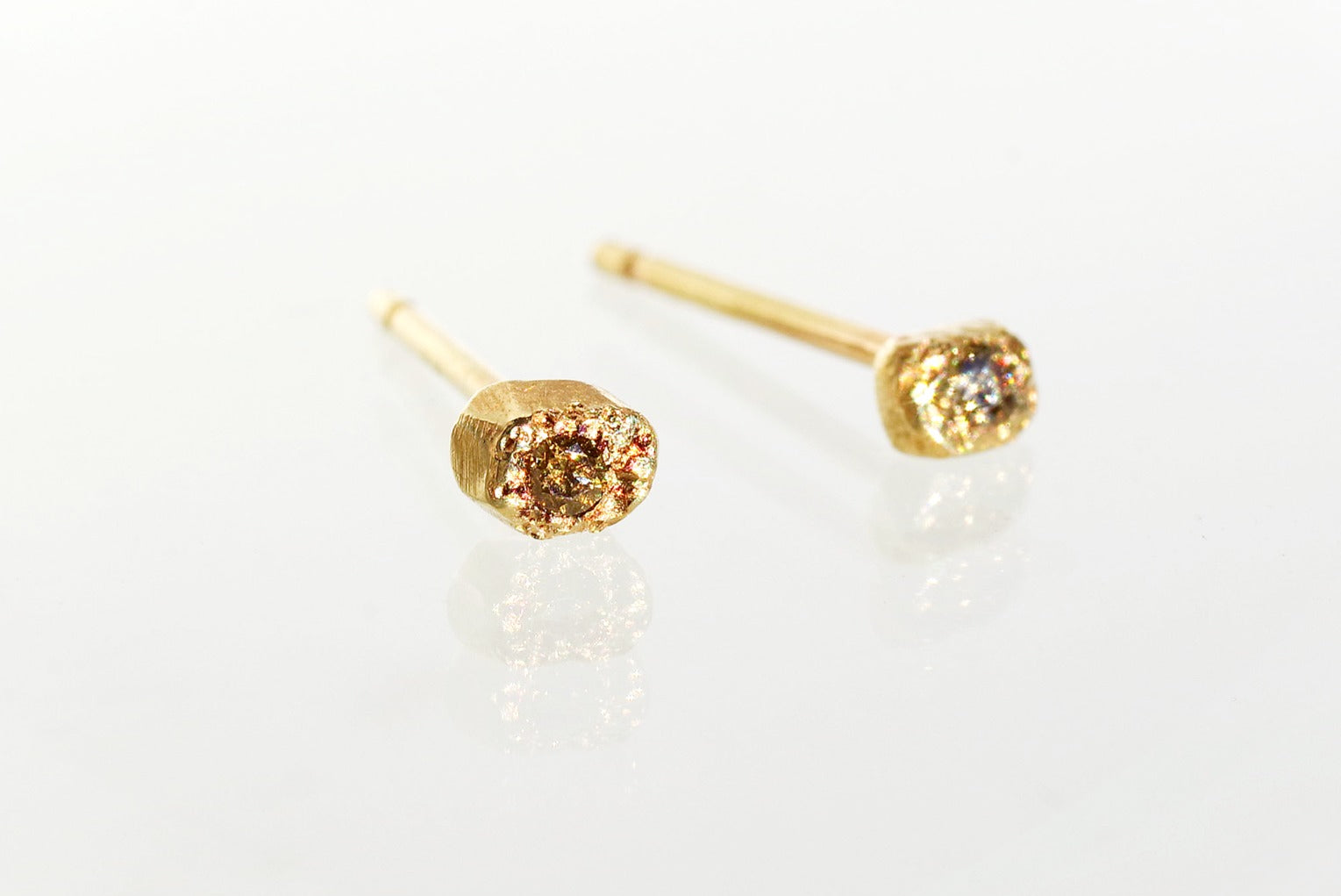 Earrings set with diamonds on irregular, stone-like bases textured by hand.