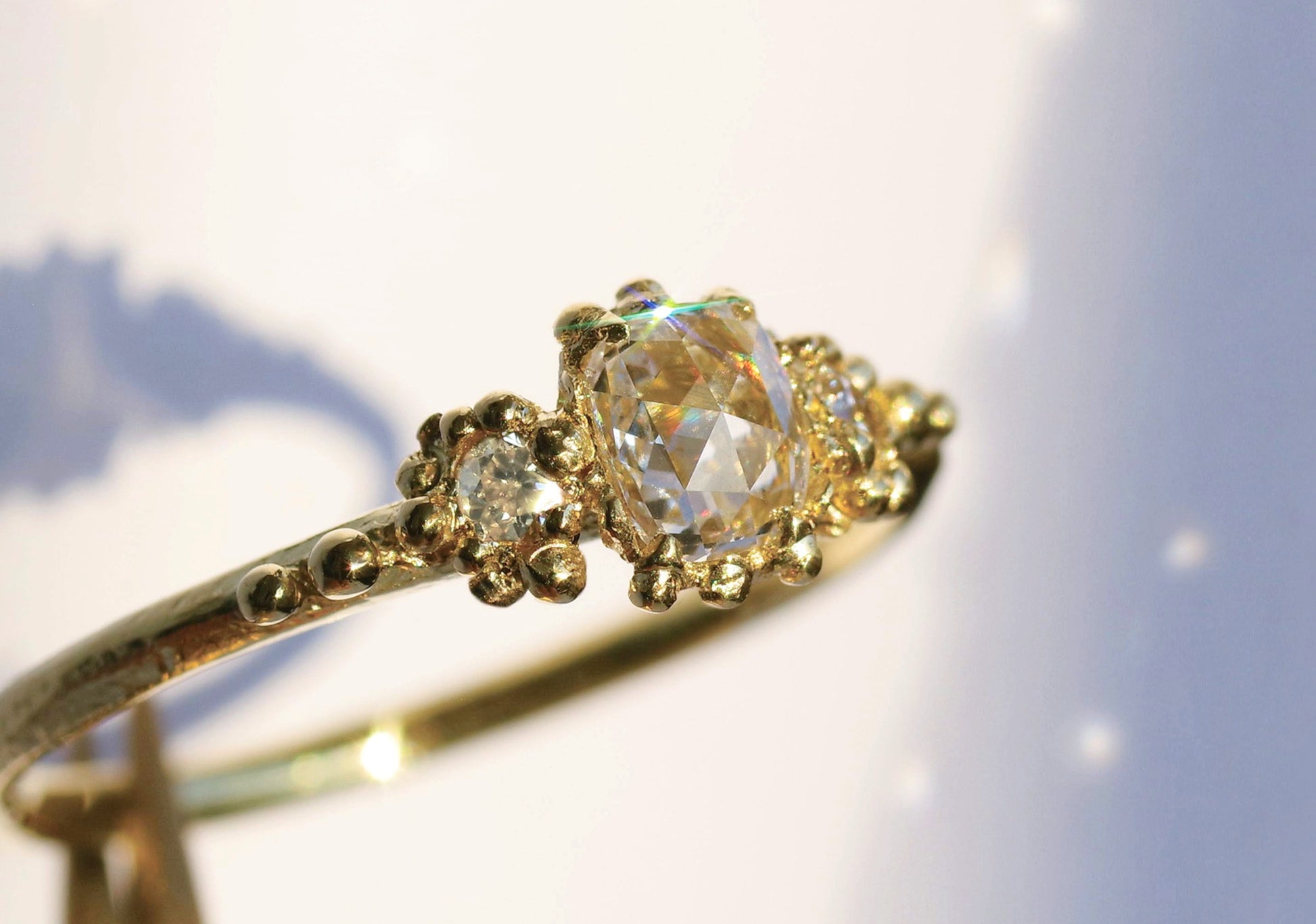 A one-of-a-kind cushion-cut rose-cut diamond, gently embraced by brilliant accents.