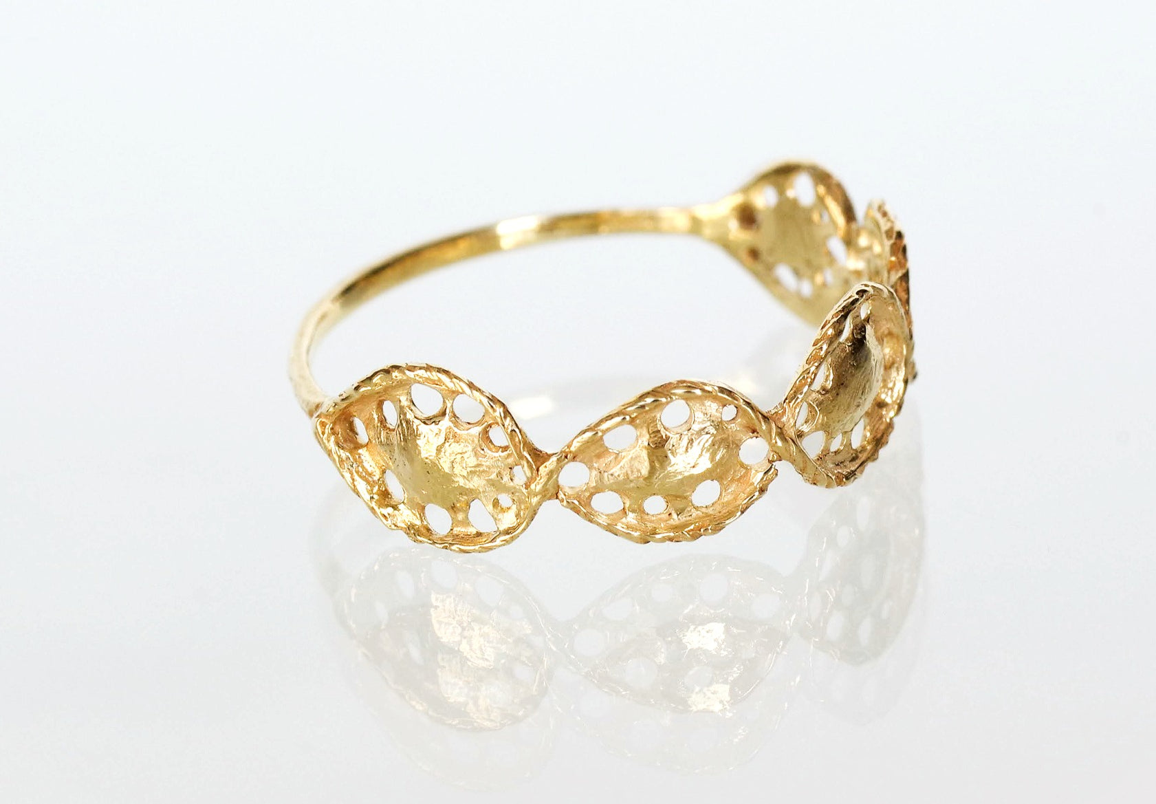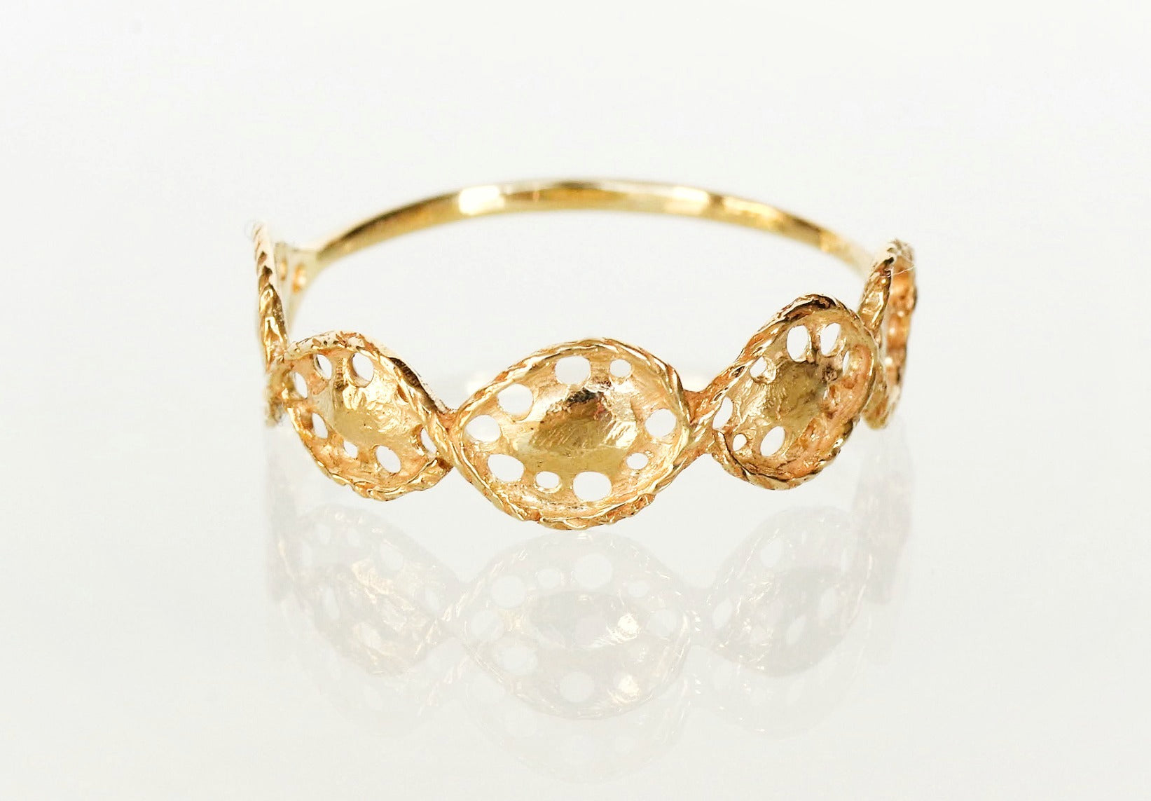 Tightly twisted yarn is trailed over a base form to shape this ring, evoking the artistry of lace making.